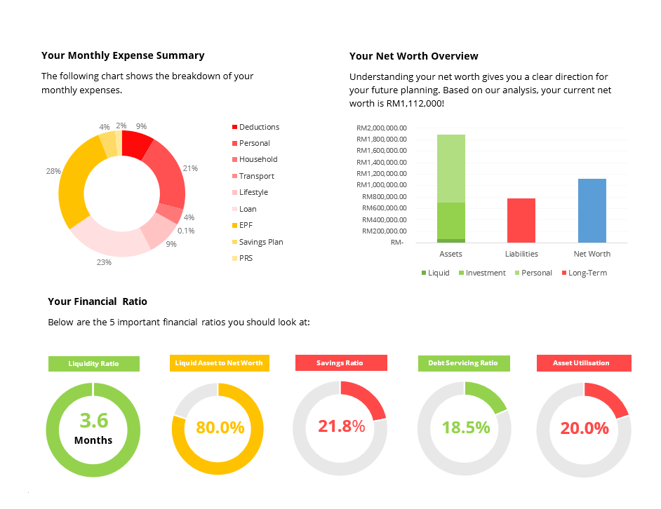 Seperti laporan kesihatan yang menerangka tahap bacan gula, kolesterol dan sebagainya – Laporan kewangan turut menilai tahap kewangan daripada pelbagai sudut aspek. Hasil keputusan tahap kewangan anda akan didokumentasi (selalunya sekitar 15-20 halaman) khusus buat anda.